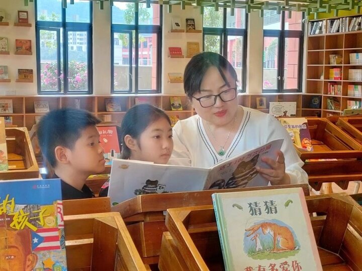 老師周末在讀書(shū)館做志愿者,與學(xué)生一起課外閱讀。