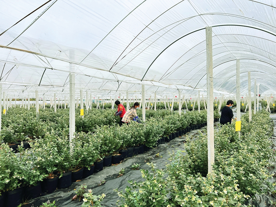 東勝村藍(lán)莓種植基地里工人在忙碌。