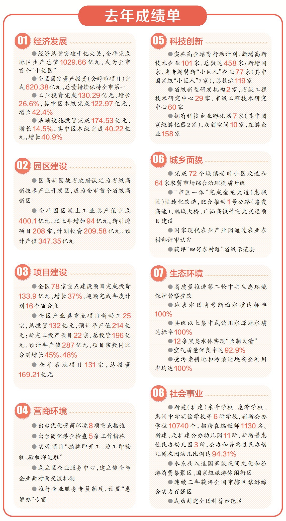 惠城提出,今年將全力抓好有效投資,加快消費提質升級,推動商貿流通業(yè)發(fā)展壯大,積極推進科技創(chuàng)新。