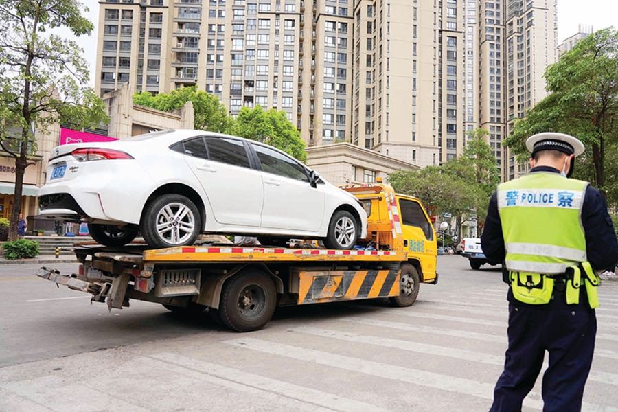 惠城區(qū)橋東街道綜合行政執(zhí)法隊(duì)將違停車輛拖走。惠州日報(bào)記者楊建業(yè) 攝