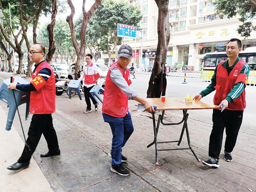 文明城市督導(dǎo)員協(xié)助商戶整理占道物品。 惠州日報記者謝菁菁 通訊員李曉雪 攝