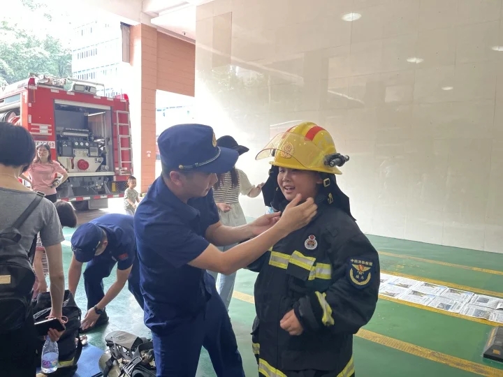 在觀摩體驗環(huán)節(jié),消防員帶大家參觀各類消防裝備及器材,講解各種裝備器材的名稱與用途,現(xiàn)場示范操作如何穿消防服、背氧氣瓶、戴面罩和消防帽,引起孩子們的濃厚興趣。看著穿戴整齊的消防員,小朋友們露出崇拜且渴望的眼神,并興致勃勃地嘗試戴搶險救援頭盔等消防裝備,還登上消防車,當了一次“小小消防員”。