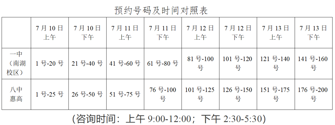 ③系統(tǒng)將返回預(yù)約號(hào)和有關(guān)信息,對(duì)照“預(yù)約號(hào)碼及時(shí)間對(duì)照表”,家長(zhǎng)應(yīng)當(dāng)在7月11日下午到第八中學(xué)(統(tǒng)一咨詢點(diǎn))進(jìn)行咨詢。