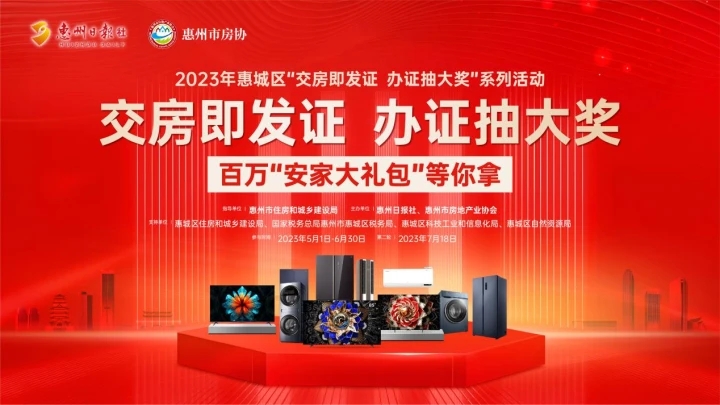 惠城區(qū)2023年“交房即發(fā)證 辦證抽大獎”政策宣傳抽獎活動在惠州市住房和城鄉(xiāng)建設(shè)局指導(dǎo)下,由惠城區(qū)住房和城鄉(xiāng)建設(shè)局、國家稅務(wù)總局惠州市惠城區(qū)稅務(wù)局、惠城區(qū)科技工業(yè)和信息化局、惠城區(qū)自然資源局提供支持,惠州日報社與惠州市房地產(chǎn)業(yè)協(xié)會聯(lián)合主辦,旨在推進(jìn)“交房即發(fā)證”這一便民措施,更好地保障購房者的合法權(quán)益,不斷提升購房、交稅、辦證等環(huán)節(jié)的便利性、滿意度。