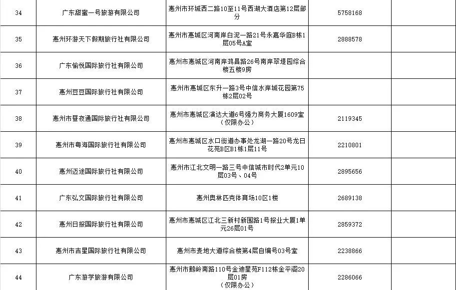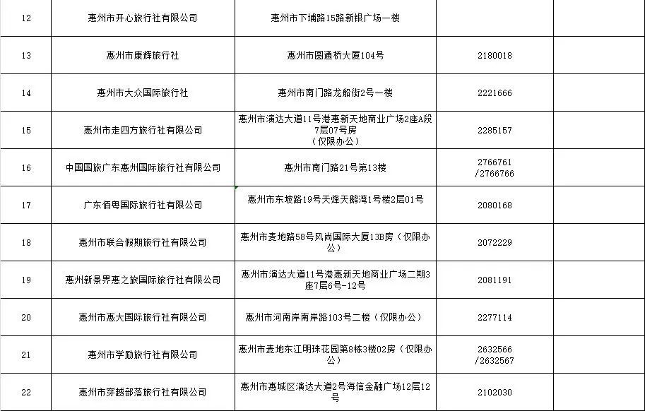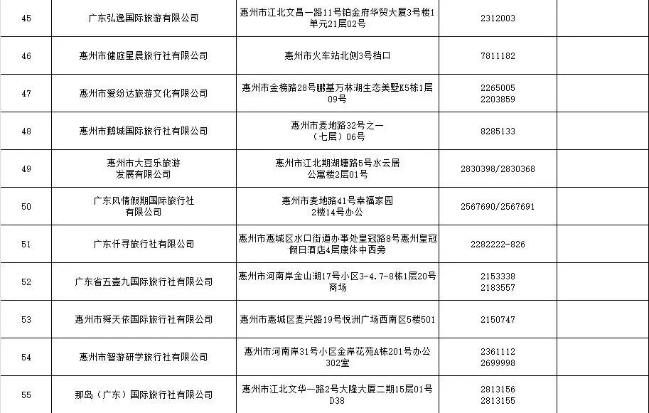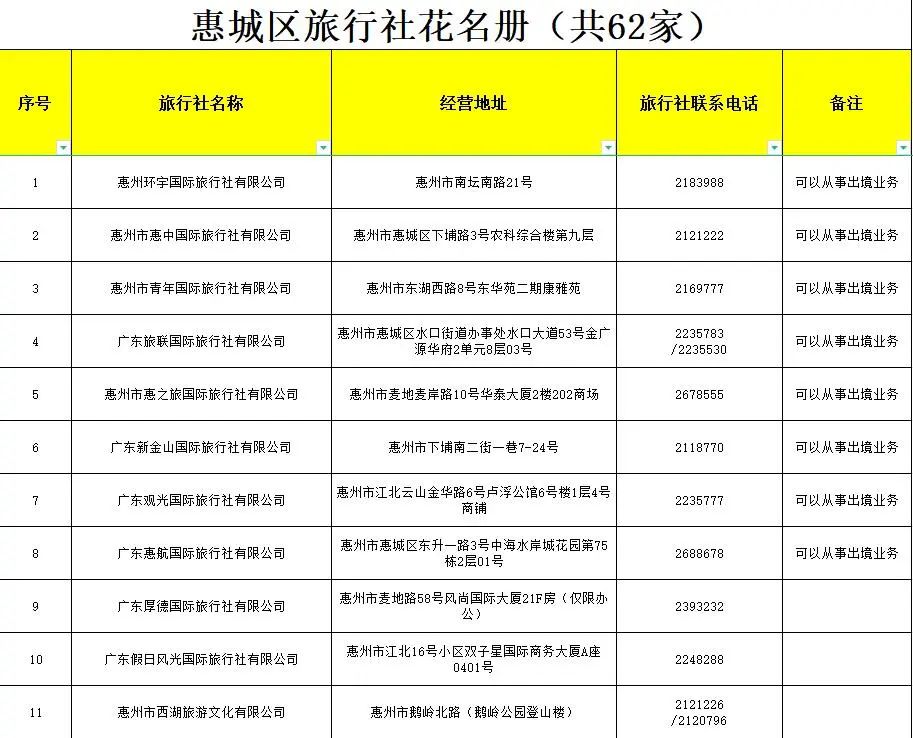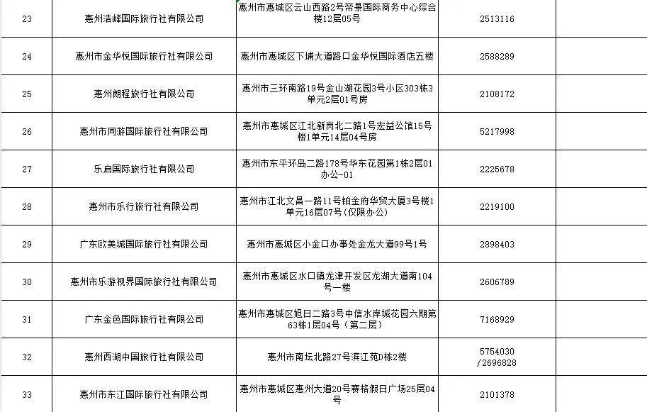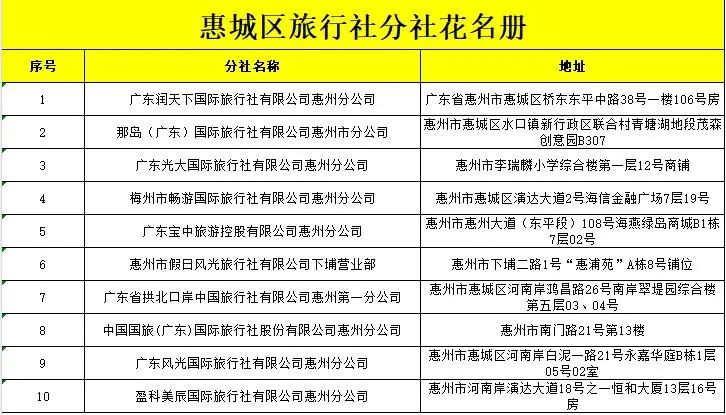 當(dāng)前,惠城區(qū)注冊備案的旅行社及分社名單如下: