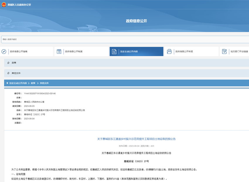《關(guān)于惠城區(qū)東江漫道鄉(xiāng)村振興示范帶提升工程項(xiàng)目土地征收的預(yù)公告》截圖: