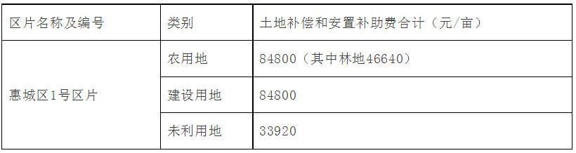 土地補(bǔ)償費(fèi)和安置補(bǔ)助費(fèi)按《惠州市人民政府關(guān)于公布實(shí)施征收農(nóng)用地區(qū)片綜合地價(jià)的公告》(惠府公〔2021〕4號)規(guī)定的惠城區(qū)1號區(qū)片綜合地價(jià)標(biāo)準(zhǔn)執(zhí)行,其中全市統(tǒng)一設(shè)定林地調(diào)節(jié)系數(shù)0.55,征收建設(shè)用地參照征收農(nóng)用地區(qū)片綜合地價(jià)執(zhí)行,征收未利用地參照征收農(nóng)用地區(qū)片綜合地價(jià)設(shè)定調(diào)節(jié)系數(shù)0.4執(zhí)行。