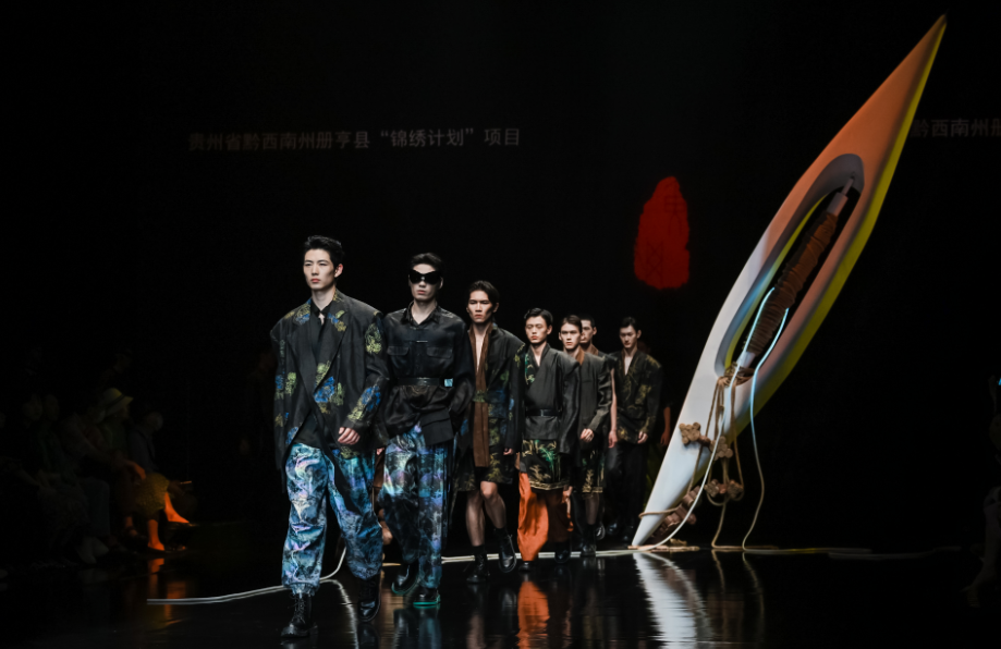黃剛介紹:“‘錦繡中華’系列服裝能夠體現(xiàn)‘錦繡計(jì)劃’的初衷,冊(cè)亨有很多繡娘,還有做蠟染、吊染、扎染的一些匠人,他們?cè)O(shè)計(jì)制作的產(chǎn)品比較特別,我們把民族元素用到時(shí)尚的設(shè)計(jì)里,讓非遺跟現(xiàn)代結(jié)合、跟科技結(jié)合,于是有了今天精彩的呈現(xiàn)。”