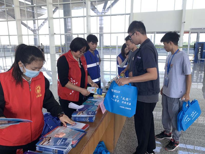 志愿者為旅客送上法治宣傳資料。惠州日報記者彭紅霞 通訊員黃美琳 攝