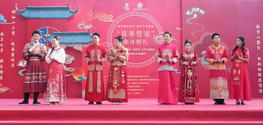 惠州日報訊 (記者馬海菊)推進移風易俗,涵養(yǎng)文明新風。日前,2023年惠州市“惠新風”鄉(xiāng)風文明建設(shè)主題系列活動(惠城站)“喜事管家”集體婚禮,在市文明村——惠城區(qū)水口街道下源村舉行。4對新人身著傳統(tǒng)中式禮服,在親朋、嘉賓的祝福下走進婚姻殿堂,婚禮儀式踐行了健康向上、勤儉節(jié)約的文明新風尚。