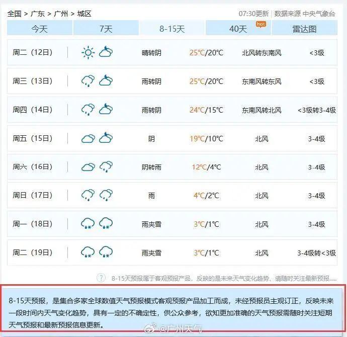 部分提供該類預(yù)報的網(wǎng)站會提醒公眾該類預(yù)報存在的不確定性。圖源:@廣州天氣