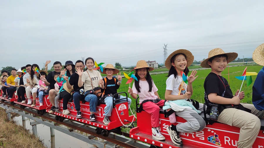 橫瀝鎮(zhèn)墨園村鄉(xiāng)村游火爆。這是游客在墨園村乘坐稻田小火車開(kāi)心游玩。惠州日?qǐng)?bào)記者彭紅霞 通訊員劉紅蘭 攝