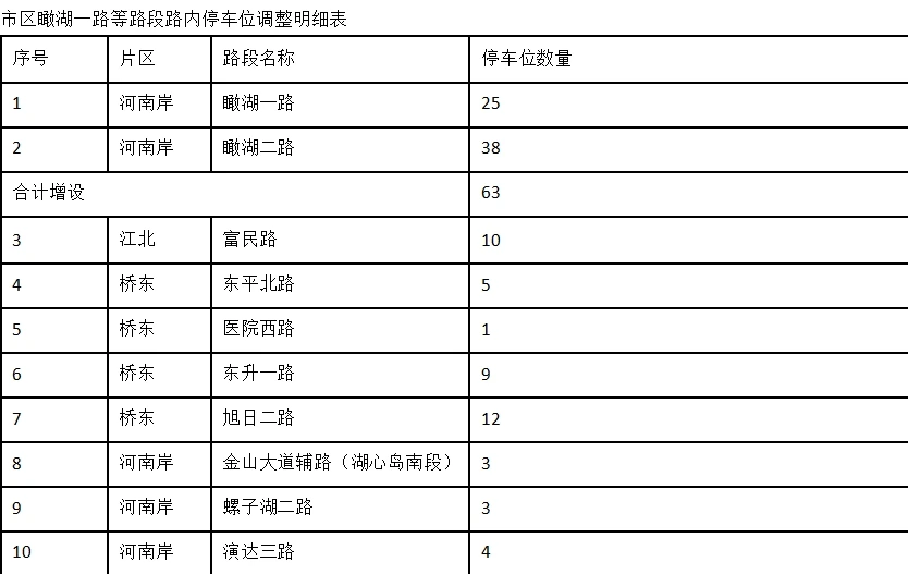 其中,河南岸片區(qū)瞰湖一路、瞰湖二路增設(shè)63個停車位。江北片區(qū)富民路,橋東東平北路、醫(yī)院西路、東升一路、旭日二路,河南岸金山大道輔路(湖心島南段)、螺子湖二路、演達三路、惠和路(瑞和家園路段),上排河坑路,水口同福南路、泰富花苑周邊路、龍湖一路、民生路、三環(huán)東二街、三環(huán)東一街16條路段撤除155個停車位。