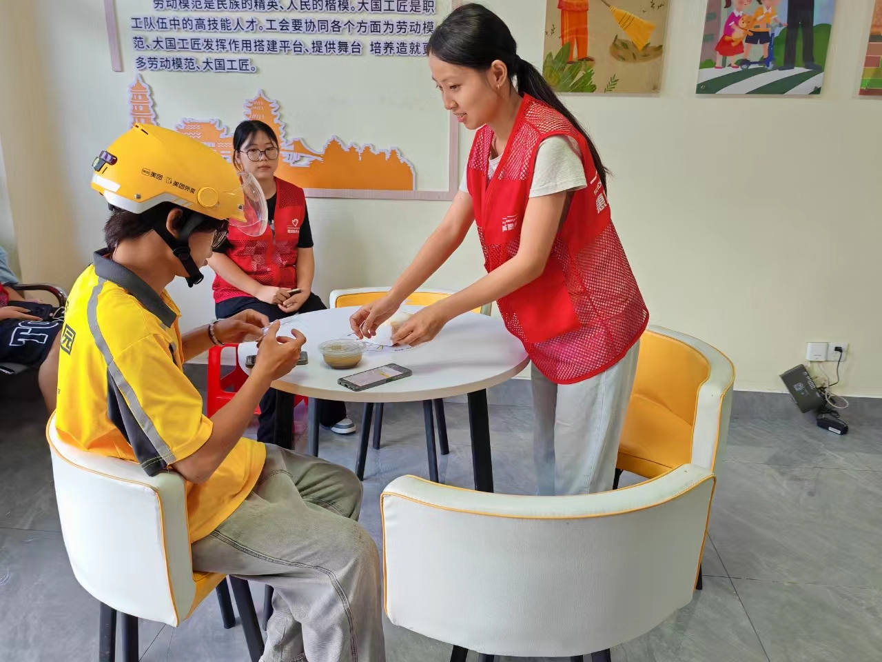 愛心驛站里,工作人員和志愿者給來到驛站休息的環(huán)衛(wèi)工人、外賣騎手等戶外勞動(dòng)者送上一份糖水;另一隊(duì)愛心使者則走出驛站,分赴佳兆業(yè)美團(tuán)站點(diǎn)與順豐水北網(wǎng)點(diǎn),將清涼的糖水送到更多勞動(dòng)者的手中。
