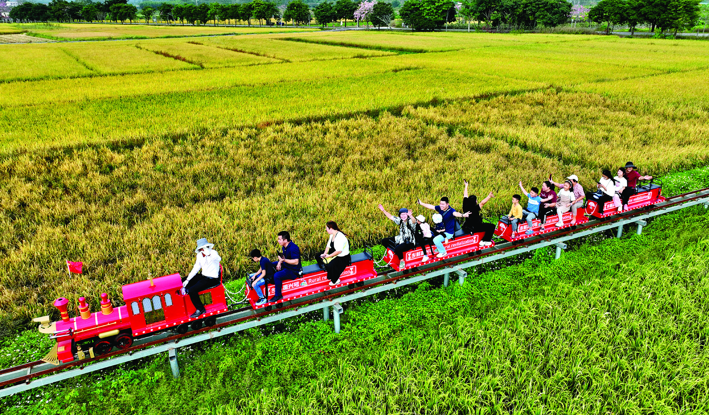 10月27日,游客在惠城區(qū)橫瀝鎮(zhèn)墨園村乘坐稻田小火車,沉浸式體驗秋收“豐”景。作為廣東省“百千萬工程”首批典型村,近年來墨園村以鄉(xiāng)村振興為主線,依托古建筑群、歷史文化,打造農(nóng)文旅串聯(lián)產(chǎn)業(yè)。營地喝咖啡、鄉(xiāng)間圍爐煮茶、稻田乘坐小火車等一個個鄉(xiāng)村文旅項目落地。秋收時節(jié),一撥又一撥游客走進滿地金黃的墨園村,體驗耕種的辛勞和收獲的喜悅。