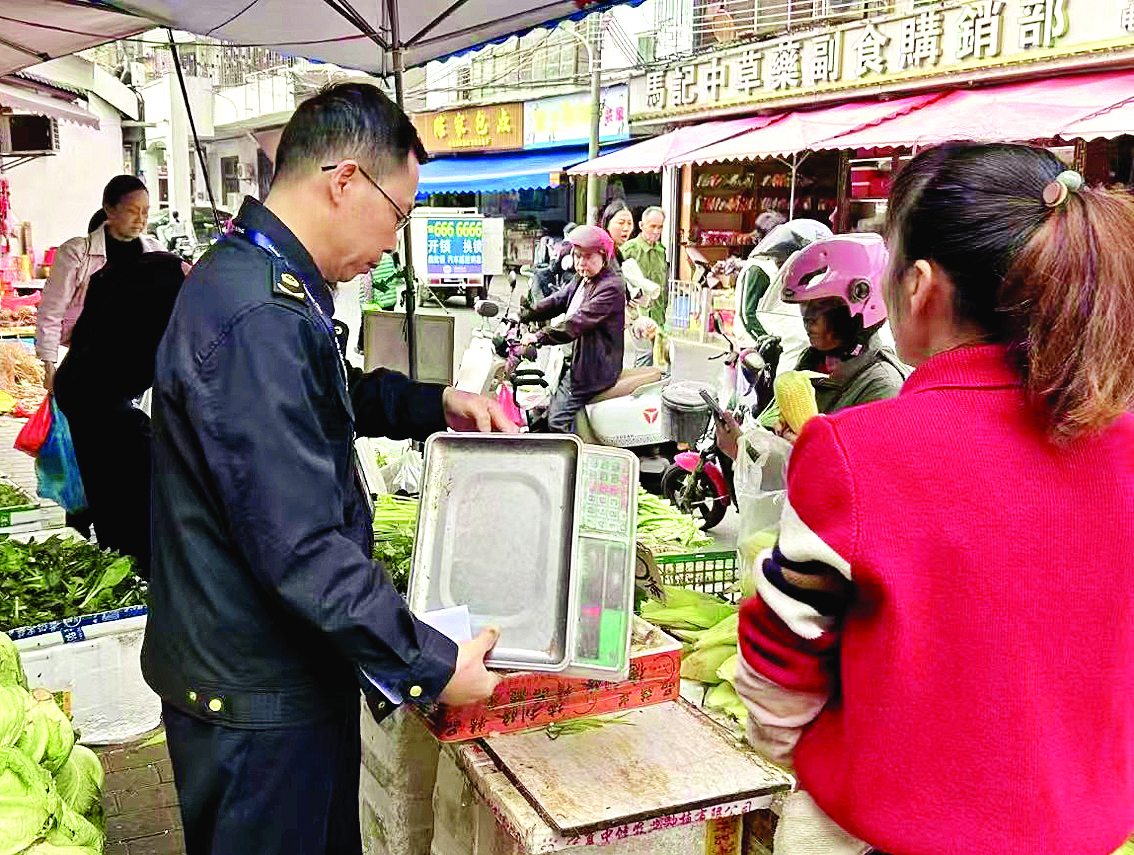 執(zhí)法人員在檢查農(nóng)貿(mào)市場電子秤。