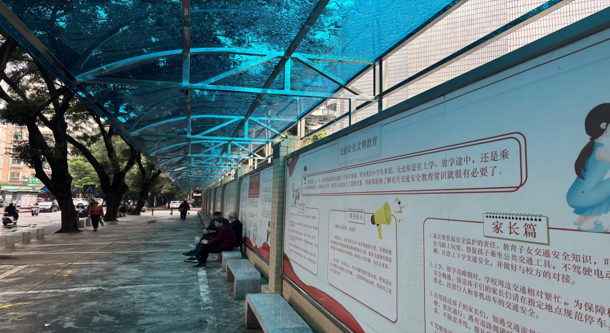 長長的廊道,光滑的石凳,透明的遮雨棚,里面還有各種科普小知識,比如交通安全守則、如何爭當(dāng)優(yōu)秀家長等。