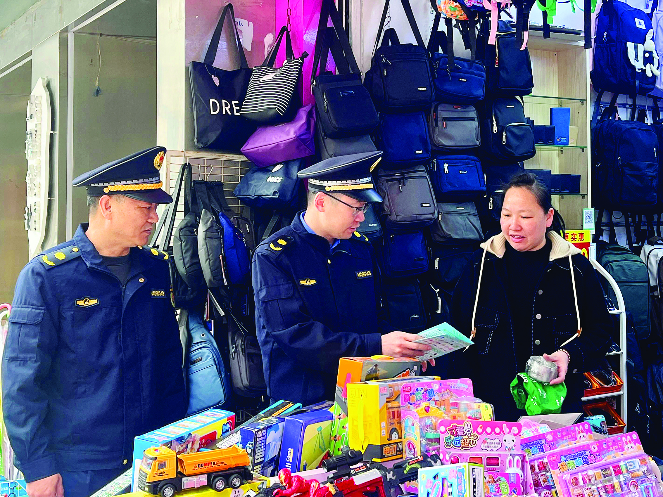 城管執(zhí)法隊員向商戶發(fā)放宣傳手冊。