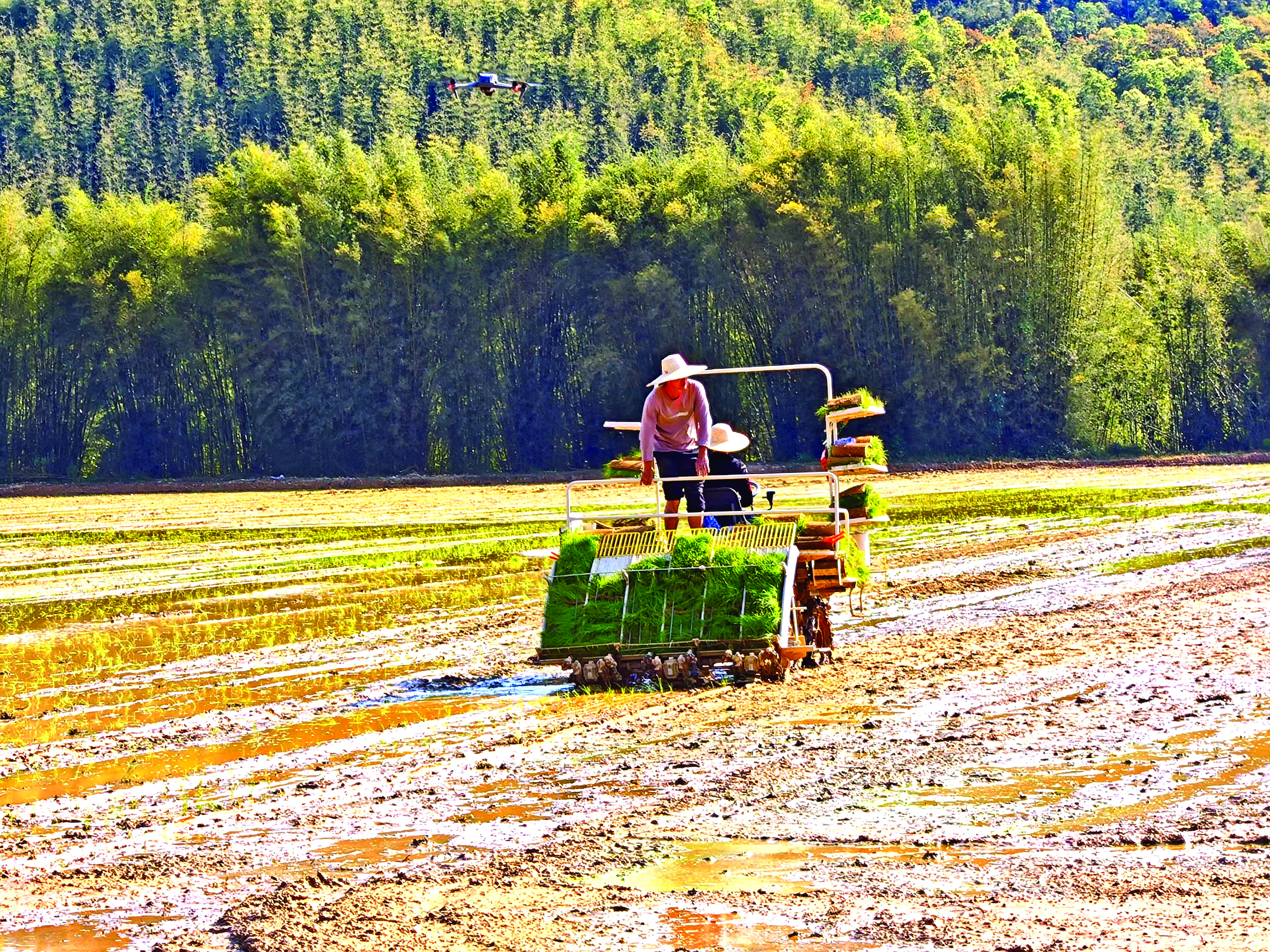 在蘆洲鎮(zhèn)嵐星村標(biāo)準(zhǔn)農(nóng)田里,機械轟鳴,三臺翻地機正編隊作業(yè)翻耕土地。插秧機在田間演示,一株株玄脂米秧苗隨機械臂擺動快速植入泥中。無人機銀翼旋轉(zhuǎn),將微量元素肥料均勻播撒。據(jù)了解,嵐星村今年春種玄脂米50畝。