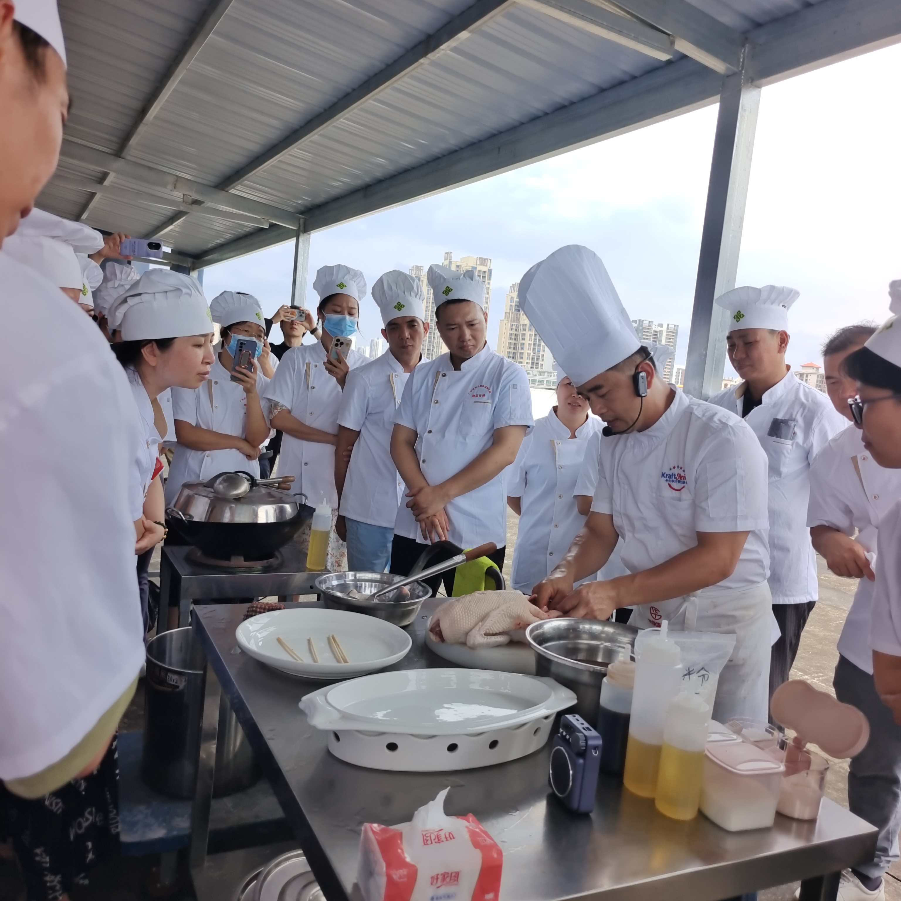 培訓現(xiàn)場,廣東省“粵菜師傅”五星級名廚、惠州市首席技師曾世英向學員講授了胡椒鴨的做法,學員們圍成一圈,仔細觀摩老師的操作,不時拍照記錄,并動手實踐,現(xiàn)場鍋碗瓢盆清脆作響,學習氛圍濃厚。