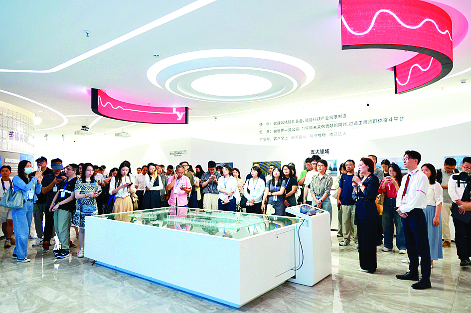 采訪團(tuán)在利元亨展廳聽(tīng)取企業(yè)運(yùn)營(yíng)情況介紹。