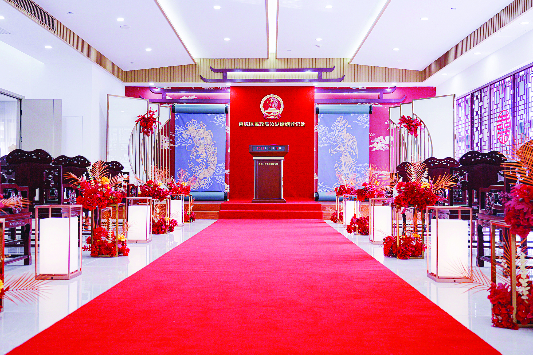 惠城區(qū)民政局汝湖婚姻登記處負(fù)責(zé)人駱娟介紹,此次啟用的汝湖婚姻登記處是惠城區(qū)民政局設(shè)立的第二個(gè)婚姻登記處。該登記處占地面積860平方米,按照國家5A級(jí)婚姻登記機(jī)關(guān)評(píng)定標(biāo)準(zhǔn),歷時(shí)3個(gè)月完成建設(shè),設(shè)有6個(gè)頒證窗口、中西式頒證廳、室外頒證點(diǎn)及婚姻家庭心理咨詢室等多個(gè)功能區(qū),將婚姻登記與特色婚俗文化、公園景觀有機(jī)融合。其中,位于千花洲景區(qū)內(nèi)的室外頒證點(diǎn)和打卡點(diǎn)正在布置中。