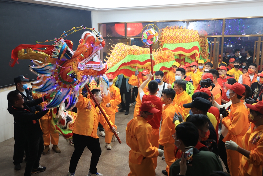 現(xiàn)場,舞龍隊隊員用力舞動著彩龍,彩龍上下翻騰,時現(xiàn)龍頭,時現(xiàn)龍尾。舞龍頭的隊員尤為用力,一拉一甩間,龍頭便神采奕奕地追逐著“龍珠”。而一旁的獅鼓隊隊員敲打著鑼鼓,舞獅上下跳躍,憨態(tài)可掬引人注目,霎時間,鑼鼓聲、鞭炮聲此起彼伏,洋溢著濃濃喜氣。