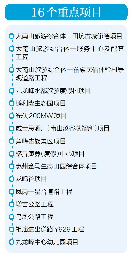 該負(fù)責(zé)人介紹,目前,16個重點(diǎn)項目正按計劃推進(jìn)。根據(jù)實(shí)際,九龍峰旅游區(qū)力爭年內(nèi)完成大南山旅游綜合體—田坑古城修繕項目、大南山旅游綜合體—服務(wù)中心及配套工程、大南山旅游綜合體—畬族民俗體驗村景觀道路、角峰畬族景區(qū)、榕昇康養(yǎng)(度假)中心、惠州金馬生態(tài)田園綜合體項目、鳳崗—星合道路、增吉公路、烏鳳公路、祖廟進(jìn)出道路Y929以及九龍峰中心幼兒園等11個重點(diǎn)項目。