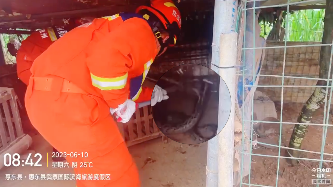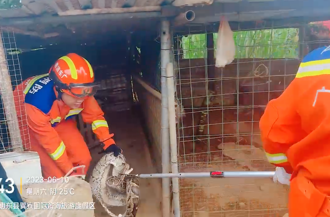 現(xiàn)場(chǎng)消防員使用捕蛇鉗工具,瞄準(zhǔn)時(shí)機(jī)果斷出手,迅速抓住蛇的頭部,整個(gè)過(guò)程僅用了不到5分鐘的時(shí)間,將該條蟒蛇控制住并順利裝入事先準(zhǔn)備好的網(wǎng)袋中。目前,大蟒蛇已經(jīng)交由惠東縣護(hù)林員放生。