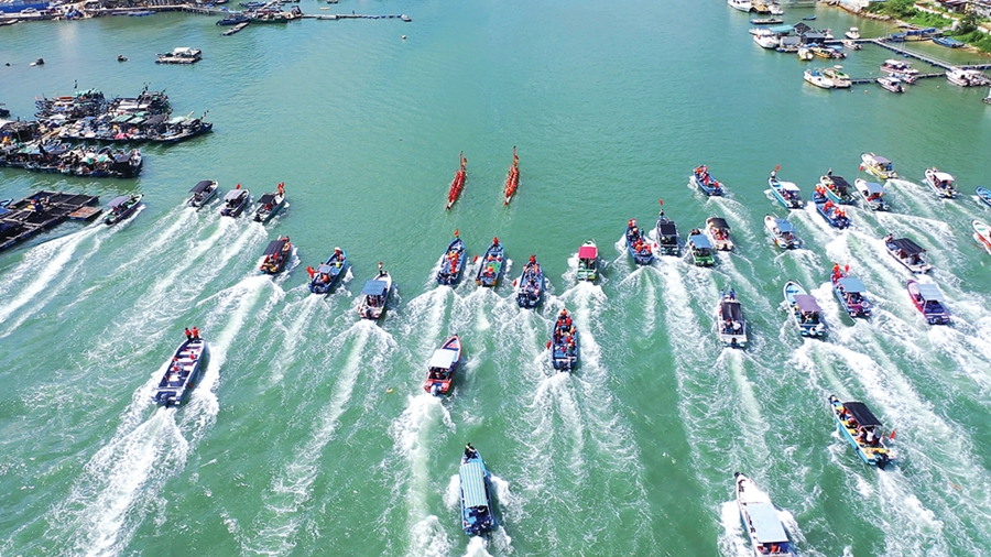 基于內灣的潮汐特性,比賽開始時間定在上午9時左右。9時13分,隨著一聲令下,兩艘龍舟沖了出去,近百條載著游客的漁船緊隨其后。