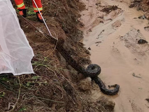 消防員到達現(xiàn)場后,在魚塘邊的水溝下找到了這條大蟒蛇!做好安全防護后,消防員利用捕蛇工具把蛇扯到地上,并將其裝入麻袋,移交給惠東縣野生救助站作下一步安置。