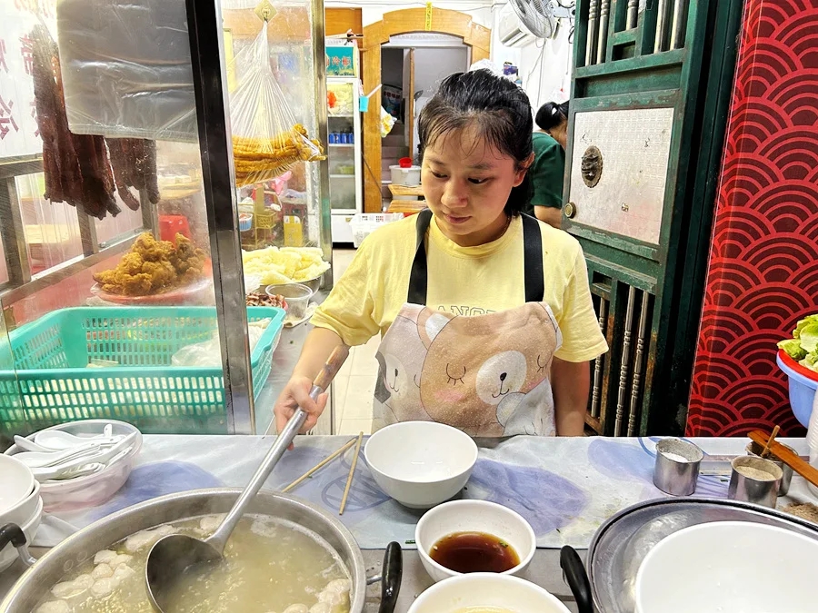 她邊忙活邊對記者說,現(xiàn)在很多老店干著干著,就面臨下一代無人接手而轉(zhuǎn)租給別人的情況,“我這一代還有兩個姐妹接手,我們各自都開了湯粉店。”史偉錦說,最開始,她爺爺只賣肉丸湯粉,隨著時代的變遷和食客口味的變化,到了上世紀八十年代增加了叉燒湯粉,如今花樣就更多了,“現(xiàn)在牛腩、燒臘等種類的湯粉都有了”。