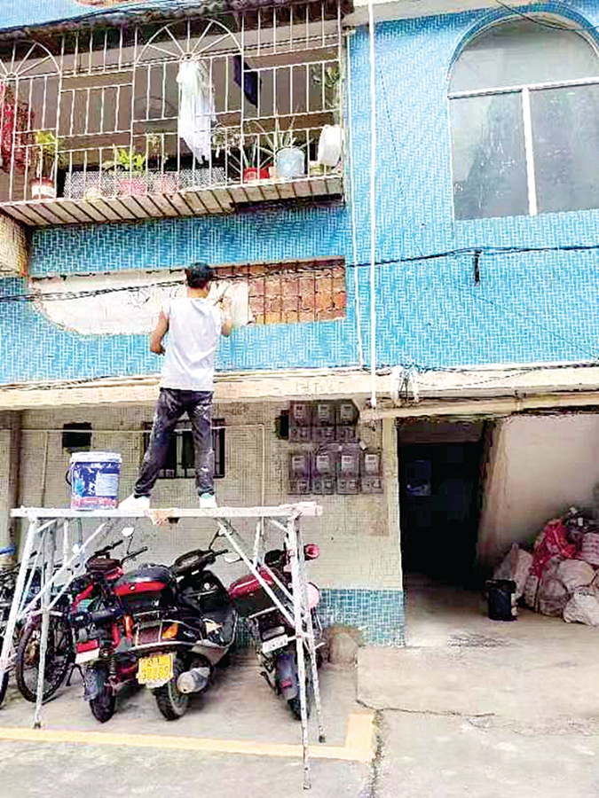為此,縣人大代表吳華明、政協(xié)委員郭偉鋒委托工作人員到惠峰花園實地走訪,深入了解小區(qū)墻面脫落程度和面積大小。吳華明在充分了解小區(qū)墻面情況后,自行出資,擬定施工計劃,集中對小區(qū)內(nèi)5棟樓的首層墻面進行修補、刷白處理。如今,修補小區(qū)墻面工程正有條不紊地進行。