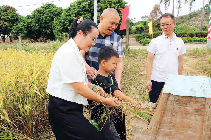 市民體驗(yàn)打稻谷。 惠州日報(bào)記者賴金朗 特約通訊員陳超 攝