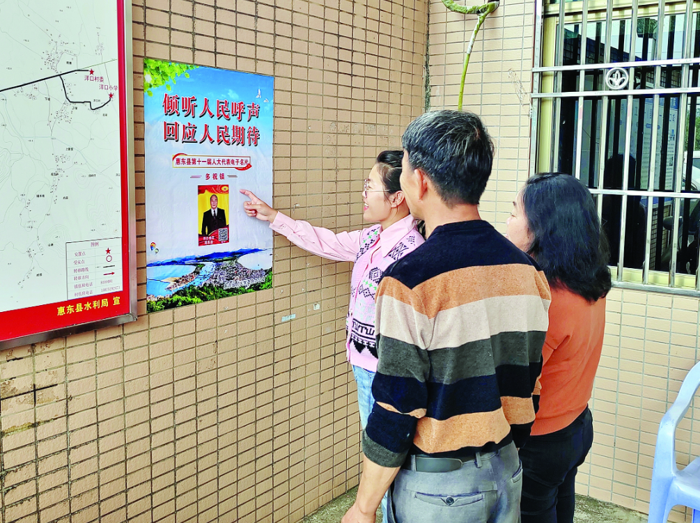 鄉(xiāng)鎮(zhèn)人大是發(fā)展全過程人民民主的重要環(huán)節(jié)。11月份以來,惠東全縣各個(gè)村委會(huì)門前、村里的宣傳公告欄多了一張制作精美的海報(bào)。“傾聽人民呼聲、回應(yīng)人民期待”兩行字下面印有惠東縣十一屆人大代表的照片、姓名以及選區(qū)信息,每位代表照片的右下角有一個(gè)二維碼,這是人大代表線上聯(lián)絡(luò)站的入口端。