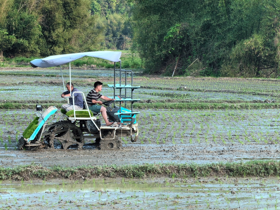 在寶口鎮(zhèn)龍坪村,駐村工作隊隊員與龍坪村黨支部書記、村委會主任謝建新一道在插秧。“有些田地因地形地勢等原因,大型機器沒辦法用上,我們只能帶著村民搶農(nóng)時、干農(nóng)活。”謝建新說。