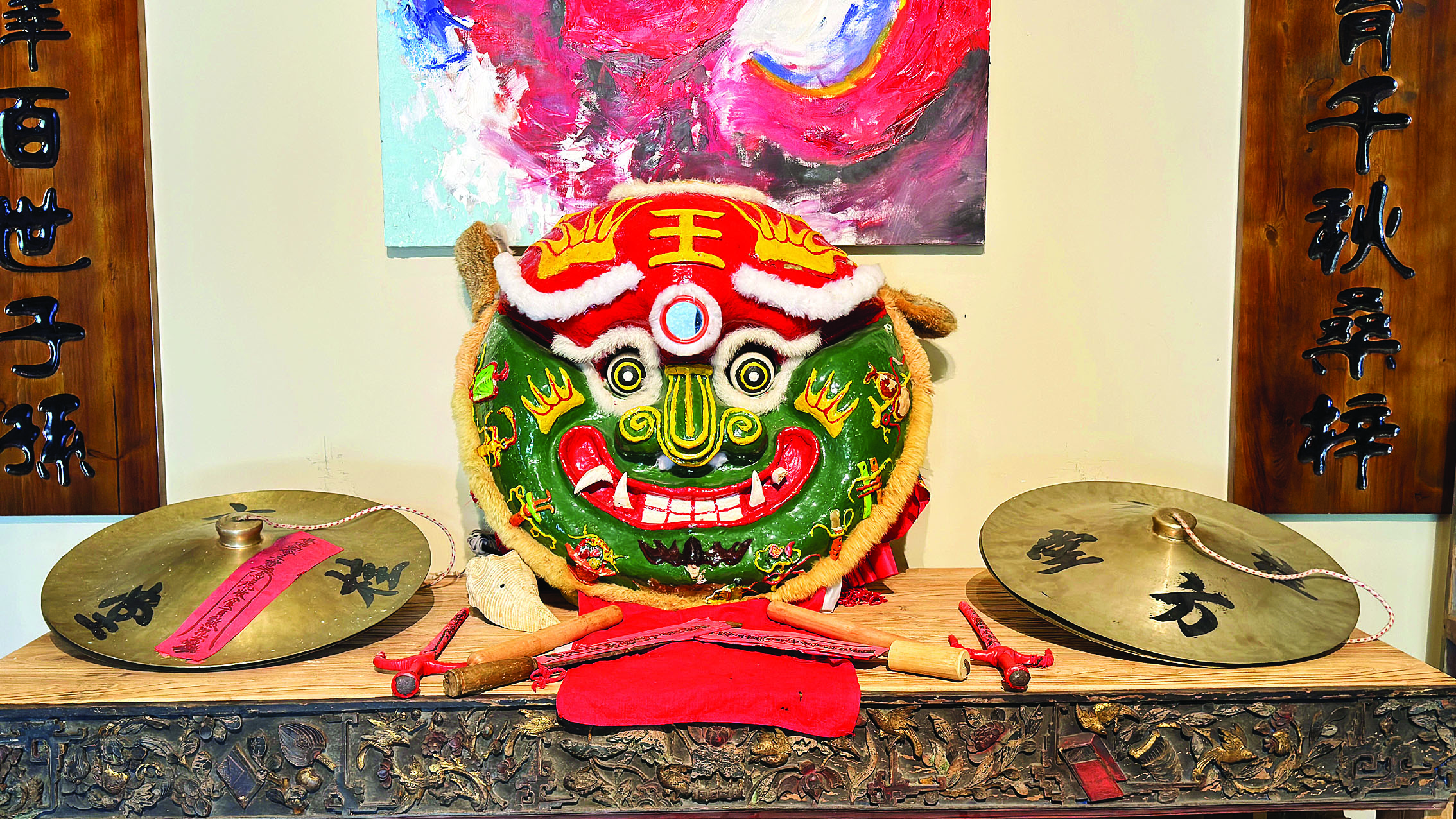 溪美村史館最讓村民津津樂(lè)道的當(dāng)屬“鎮(zhèn)館之寶”蓋子獅。只見(jiàn)蓋子獅頭部狀似鍋蓋,紅額青面、口闊、目大、鼻短,面額正中寫有“王”字。據(jù)悉,溪美村蓋子獅源于清代,是鐵涌方氏族人的傳統(tǒng)舞蹈,由方氏先祖口傳身授,流傳至今。每逢年節(jié)、婚姻嫁娶、新居落成等慶典活動(dòng),當(dāng)?shù)孛癖姸紩?huì)舞獅祈求風(fēng)調(diào)雨順、國(guó)泰民安、福祿長(zhǎng)壽。2018年,鐵涌蓋子獅(傳統(tǒng)舞蹈)被列入市級(jí)非物質(zhì)文化遺產(chǎn)名錄。2022年被列入省級(jí)非物質(zhì)文化遺產(chǎn)項(xiàng)目。