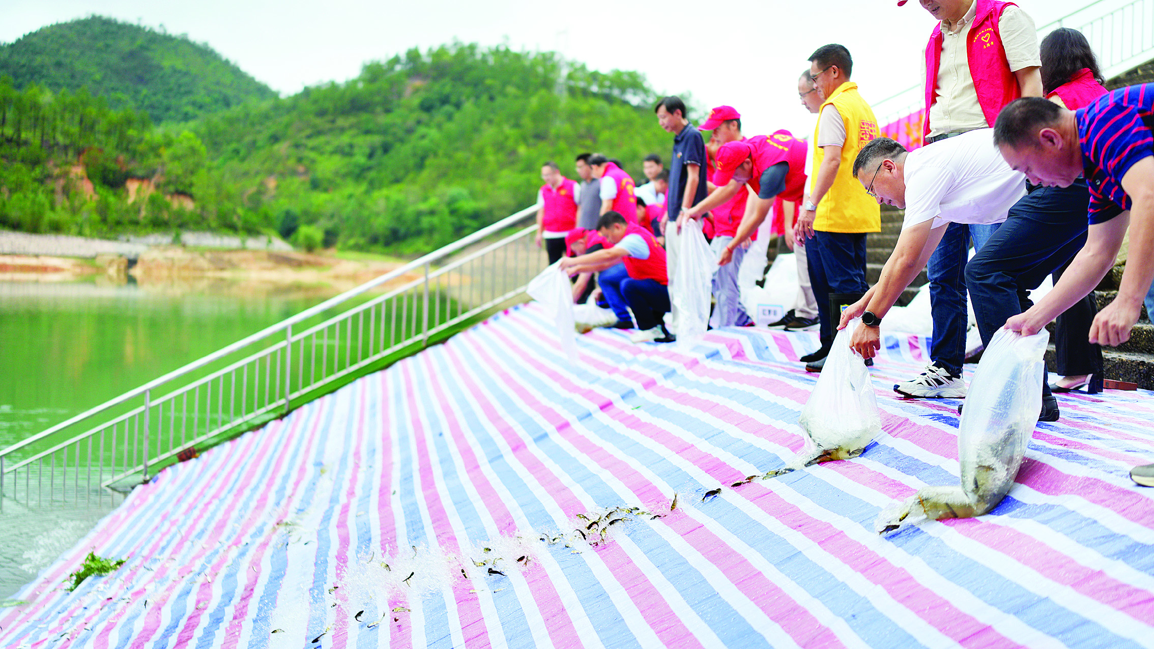 活動(dòng)共投放了鰱、鳙等成魚和魚苗約100萬尾。惠州日報(bào)記者陳春惠 通訊員李慶勇 攝