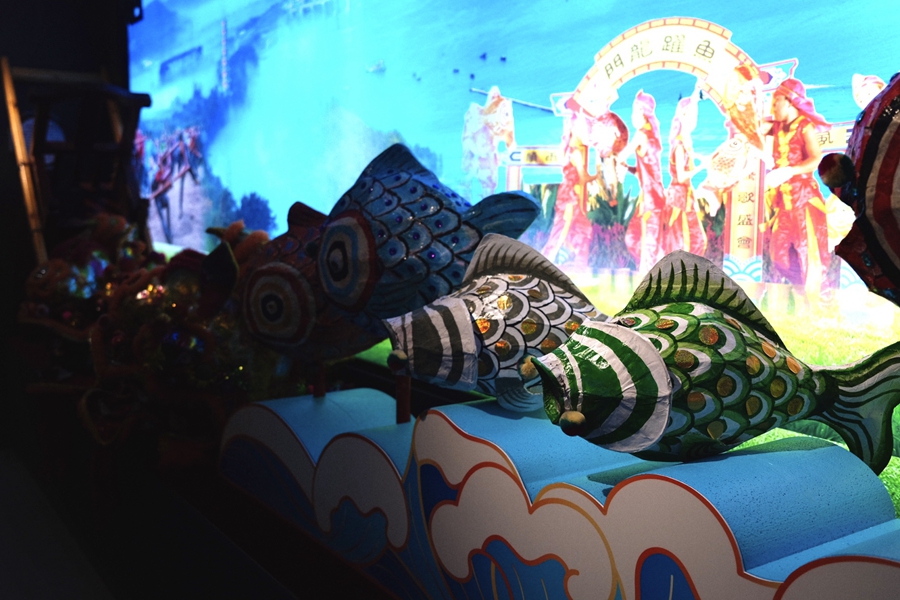 活動(dòng)現(xiàn)場,惠東蓋子獅在大廳門口恭候各方來客。在該展廳入口處,一艘疍家屋船擺放在夕陽映照的大海幕景墻旁。疍家屋船制作技藝是市級(jí)非物質(zhì)文化遺產(chǎn),疍家屋船主要分布在惠東縣沿海地區(qū)。走進(jìn)展廳,迎面是一幅惠東縣非物質(zhì)文化遺產(chǎn)分布圖。沿著展廳環(huán)形走廊可欣賞各類非物質(zhì)文化遺產(chǎn)展品:惠東蓋子師威風(fēng)凜凜,頭頂盤繞的巨型草龍活靈活現(xiàn),稔山女子白字戲、惠東漁歌演員造型形象逼真、表情豐富,大嶺逗姥爺表演的道具和背后真實(shí)場景圖片融為一體,體驗(yàn)感十足。展廳內(nèi)通過靜態(tài)展覽、動(dòng)態(tài)展示、活態(tài)展演的綜合運(yùn)用,不僅充分展示了惠東縣在開展非遺保護(hù)工作所取得的豐碩成果,還為群眾提供了一站式飽覽惠東非遺魅力的文化空間。