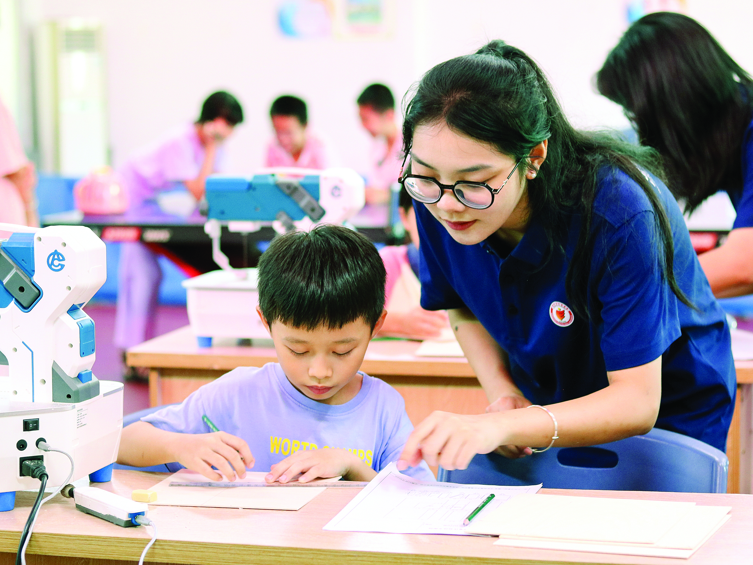 突擊隊(duì)成員在指導(dǎo)小朋友學(xué)習(xí)如何操作儀器。