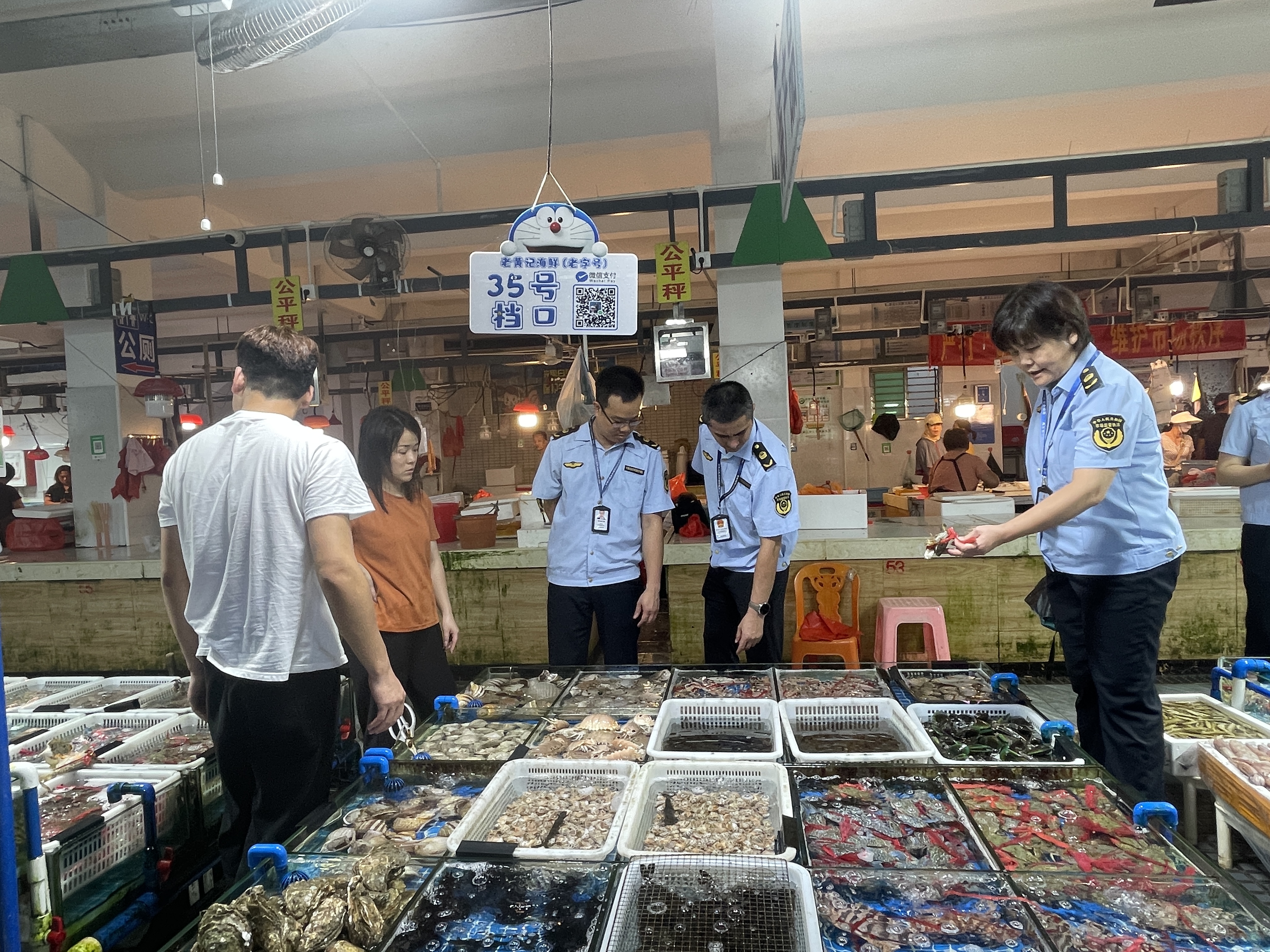 執(zhí)法人員在海鮮市場(chǎng)檢查。惠州東江圖片社供圖