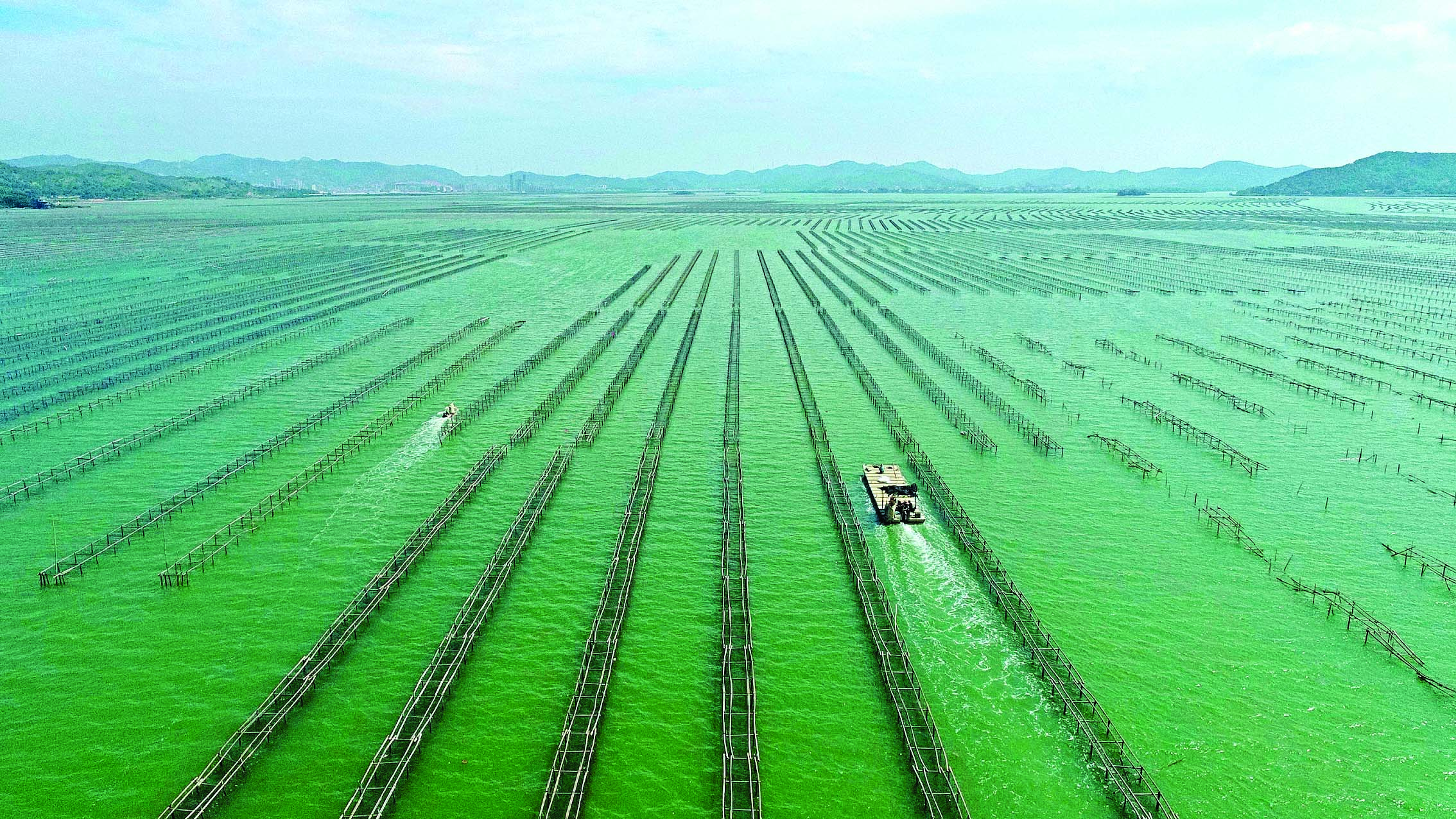 蠔農(nóng)出海前往養(yǎng)殖區(qū)采收生蠔。