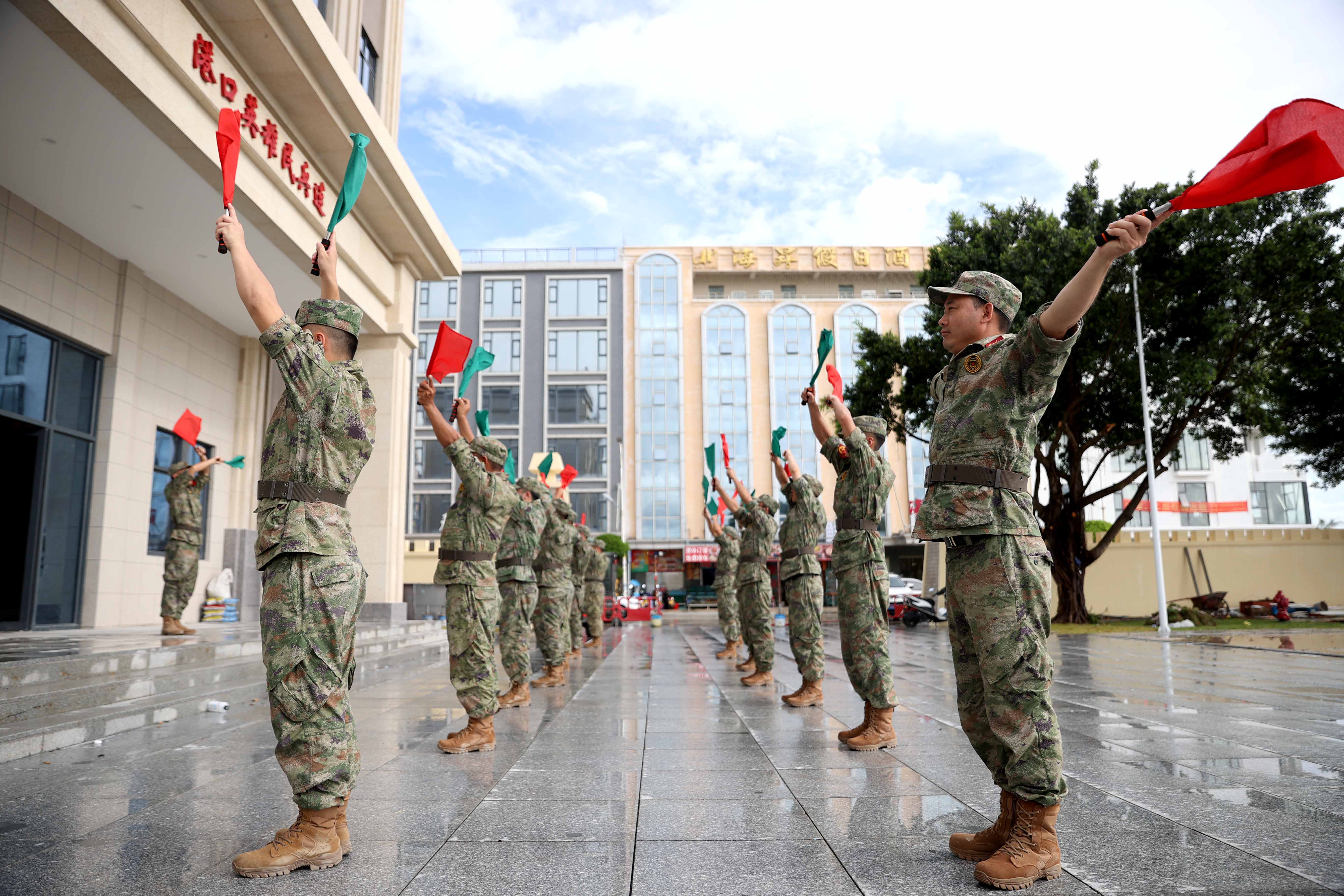 惠東縣港口英雄民兵連的民兵在進(jìn)行指揮交通旗語訓(xùn)練。