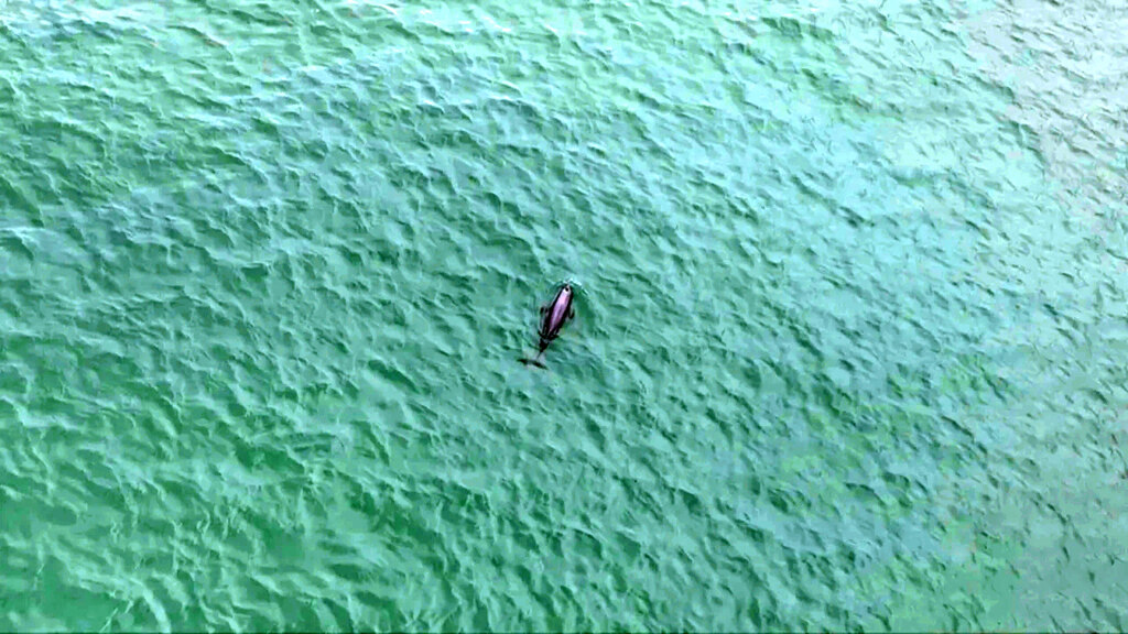 “通過航拍影像,我們可以清晰地看到它們的背脊上的疣粒區(qū)很寬,這是印太江豚的一個典型特征。”從來自中國水產(chǎn)科學(xué)研究院南海水產(chǎn)研究所科研人員拍攝的視頻可以看到,3頭印太江豚在湛藍的海水中肆意暢游,非常活躍。據(jù)該所科研人員介紹,當天下午3點左右,他們正在海龜灣附近海域航拍監(jiān)測時發(fā)現(xiàn),平靜的海面上,突然出現(xiàn)1頭江豚,四處游動捕食,非常活躍,到了下午6點又有另外2頭江豚加入進來。這3頭江豚捕食的地方就位于港口海龜灣附近海域,距離海灘僅約90米。