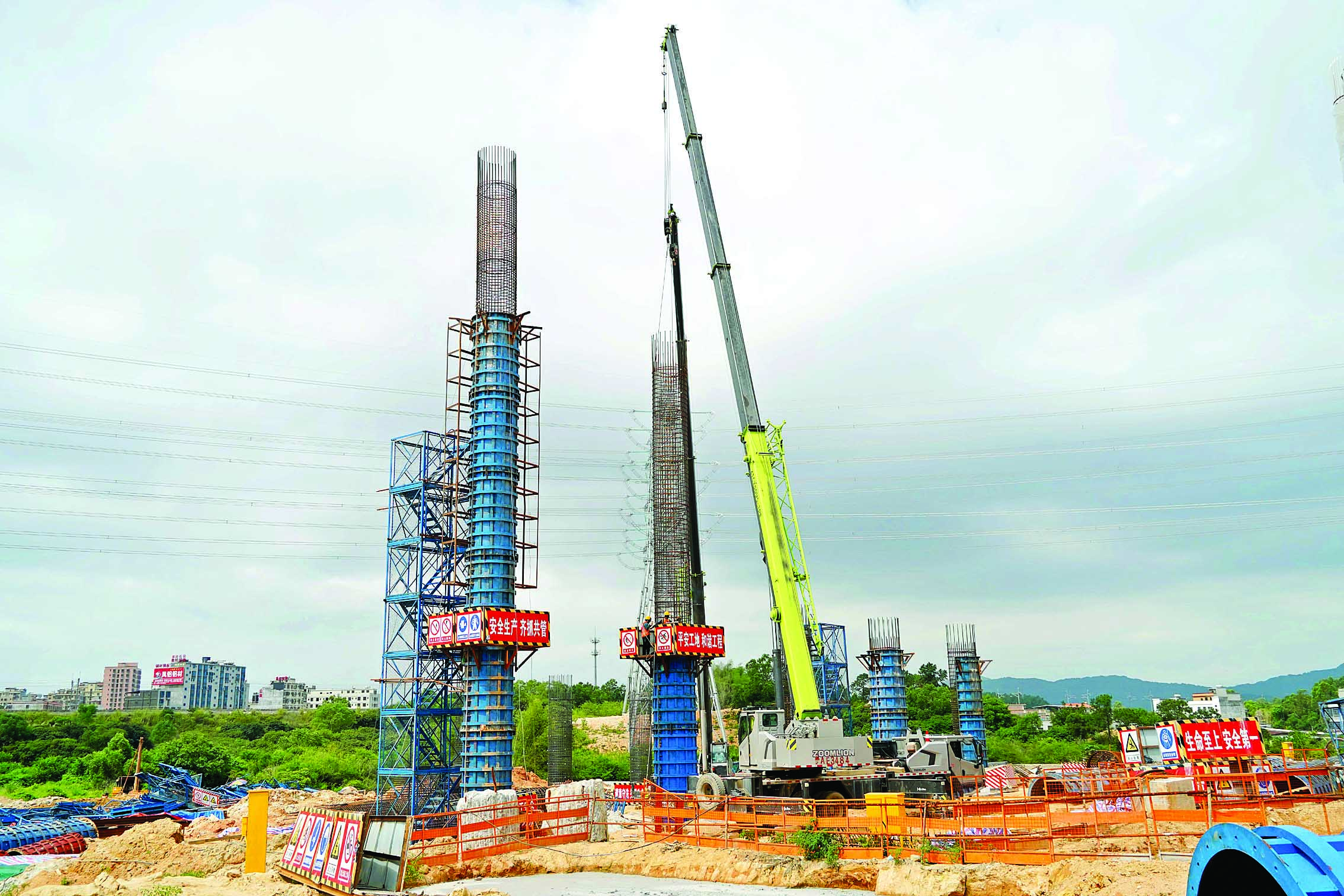 在惠州稔平環(huán)島高速考洲洋大橋施工現(xiàn)場,只見南、北兩個主塔的樁基、承臺部分已經(jīng)完工,數(shù)十根橋墩穿出水面,屹立在考洲洋中。目前,施工人員正在開展主塔塔身及引橋下部結(jié)構(gòu)施工。