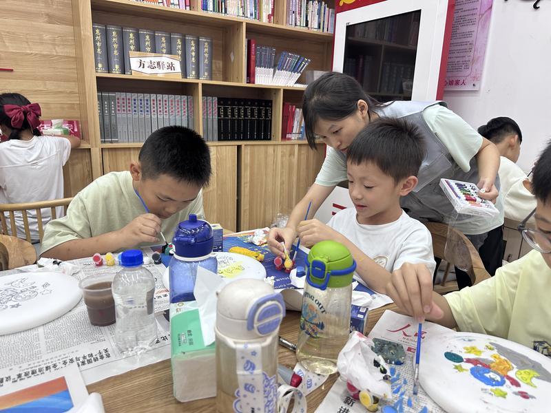 大學(xué)生志愿者教孩子們手繪飛盤。 惠州日報記者賴金朗 攝