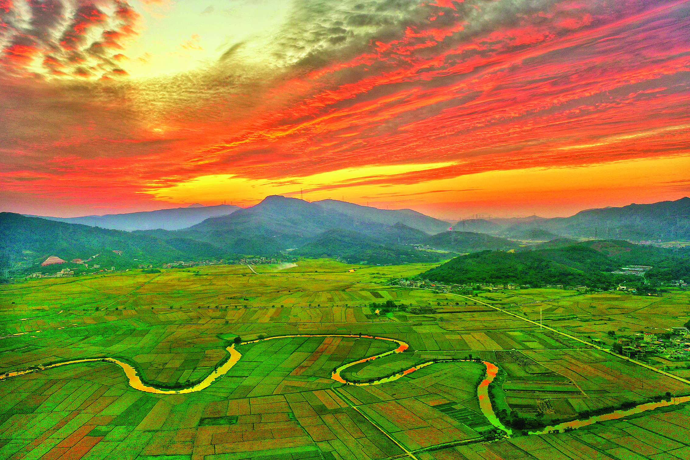 秋日傍晚,惠東縣稔山鎮(zhèn)竹園村稻田一片美麗景象。航拍視角下,黃綠稻浪如調(diào)色盤鋪展,蜿蜒河流在晚霞下泛著金波,與遠(yuǎn)山、絢爛云霞構(gòu)成夢(mèng)幻畫卷。