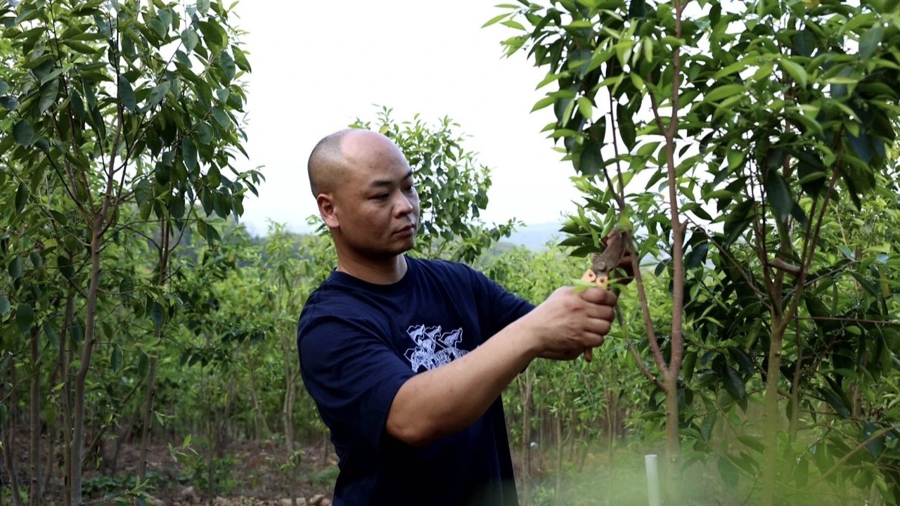 清晨的稔山白云村,山坳里連片的樹林間,飄散著一股淡雅的香氣。一名中年男子穿梭在林間,時(shí)而撥弄樹枝,察看樹木生長(zhǎng)情況,時(shí)而用指甲輕輕刮開樹皮,聞聞樹的氣味。他不時(shí)點(diǎn)點(diǎn)頭,臉上露出滿意的神色。男子身處的這片樹林,種植的是聞名遐邇的綠棋楠沉香樹。
