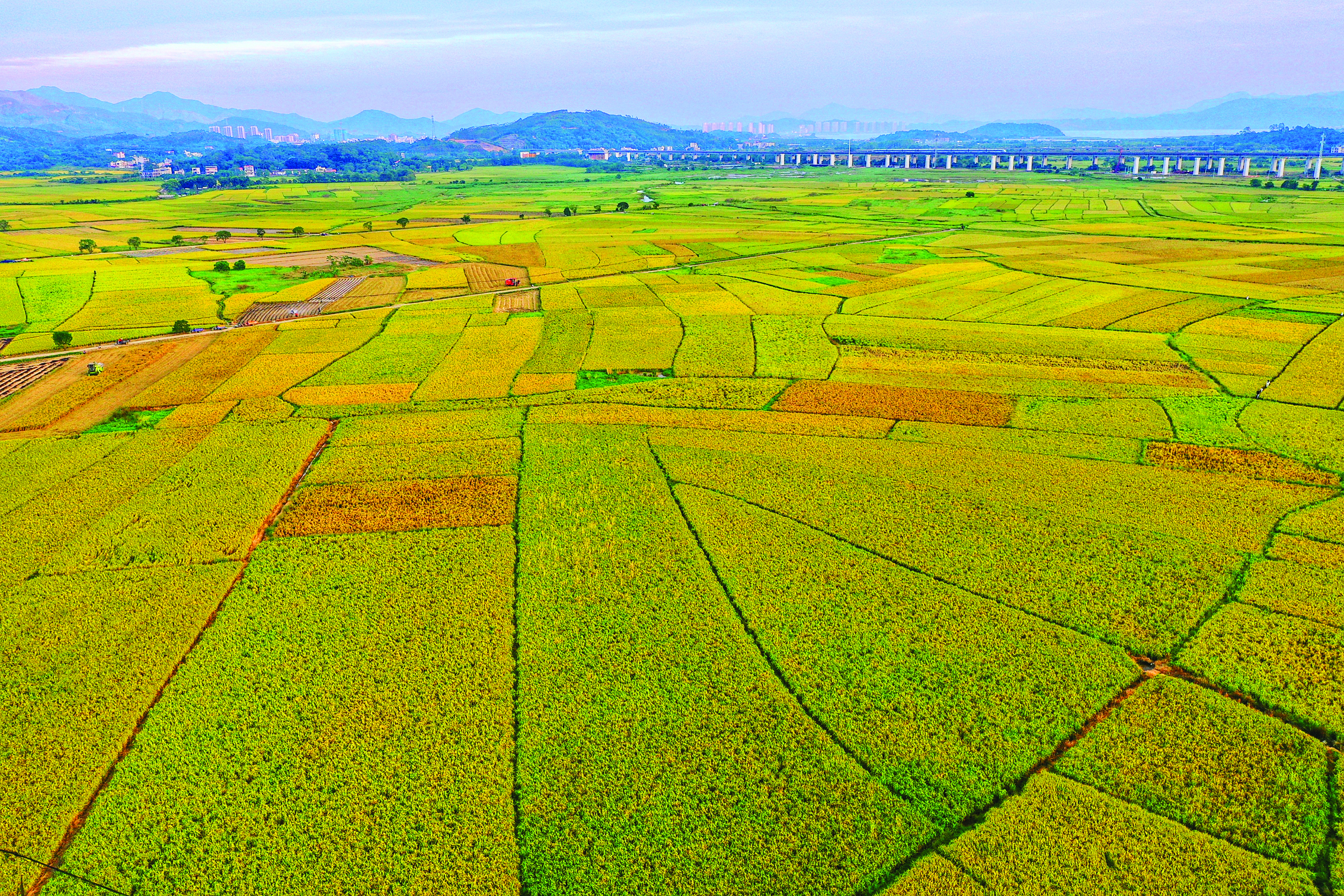 金秋,惠東縣稔山鎮(zhèn)竹園村約3800畝晚稻“豐”景如畫。金黃的稻穗壓彎了腰,層層稻浪伴著海風(fēng)翻涌。從空中俯瞰,金黃色的稻田與蔚藍(lán)的海洋相接,田間蜿蜒的小溪如銀帶環(huán)繞,遠(yuǎn)近皆是美麗鄉(xiāng)村的豐收圖景,勾勒出鄉(xiāng)村振興的生動模樣。收割機(jī)轟隆隆作業(yè),村民們忙著將剛收割的稻谷裝袋,臉上洋溢著豐收的喜悅。