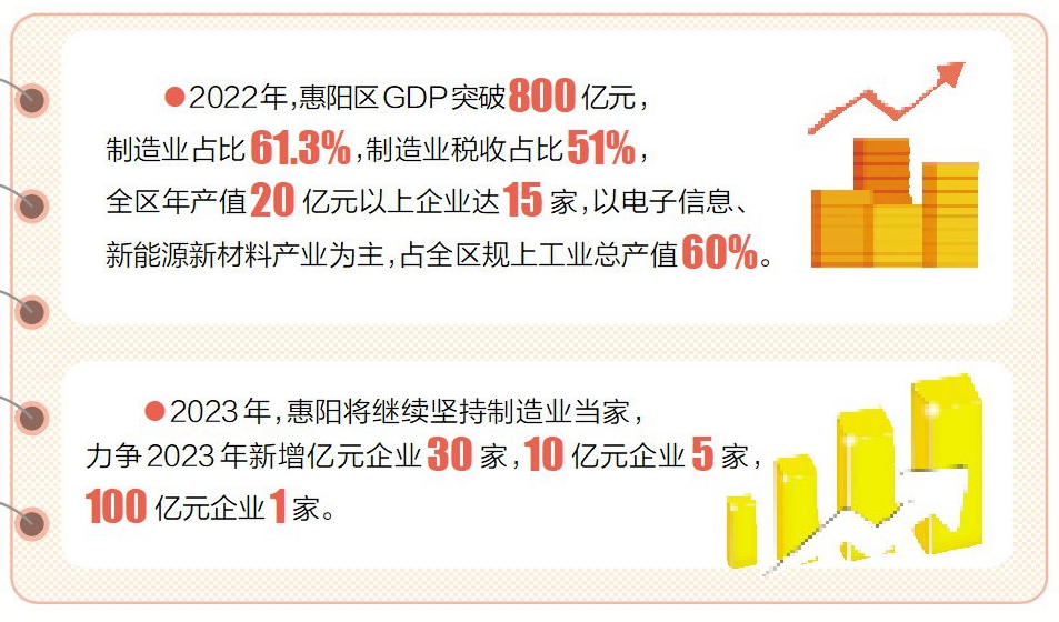 2023年,惠陽將繼續(xù)堅持把發(fā)展經(jīng)濟的著力點放在實體經(jīng)濟上,堅持制造業(yè)當家,聚力打造電子信息、新能源新材料兩大現(xiàn)代產業(yè)集群。力爭2023年新增億元企業(yè)30家,10億元企業(yè)5家,100億元企業(yè)1家。